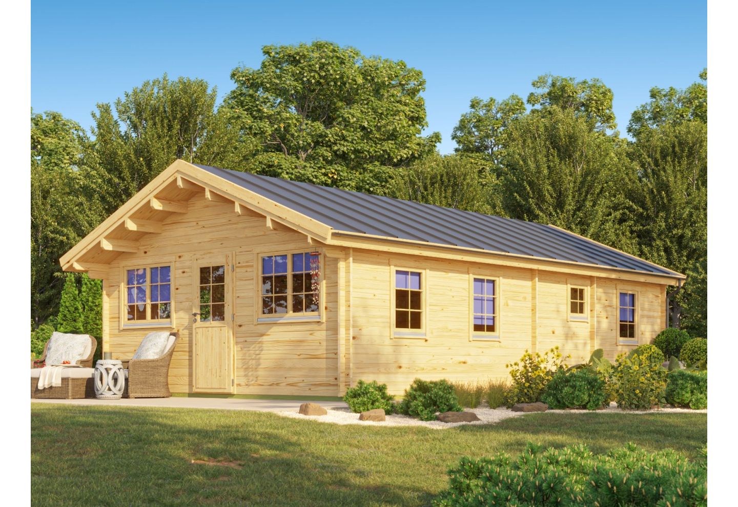 • Constructie: massief Noorse sparrenhouten balken (44 mm) voor duurzaamheid en een natuurlijke uitstraling.