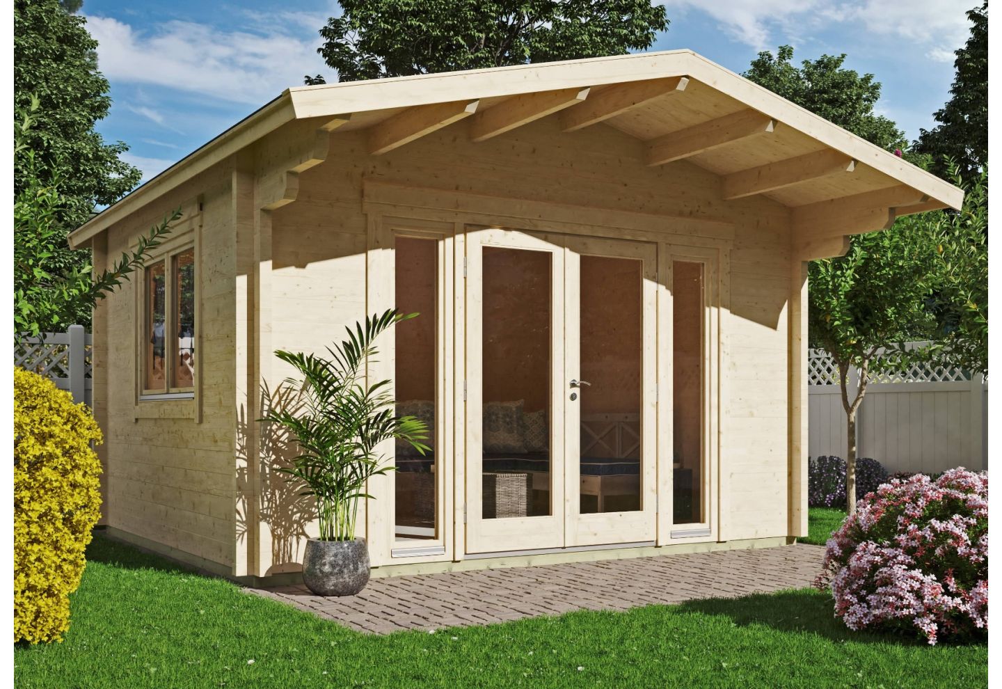 Het tuinhuis Urk 70 E biedt een royale en functionele buitenruimte van circa 14 m², ideaal voor het opbergen van tuinspullen of als hobbyruimte. Dit model heeft een klassiek zadeldak en grote dubbele deuren met dubbel glas, waardoor je eenvoudig toegang hebt en veel licht binnenkomt. Het tuinhuis wordt onbehandeld geleverd in natuurlijke houtkleur, zodat je het zelf kunt afwerken naar jouw smaak. De robuuste constructie en hoogwaardige onderdelen zorgen voor een duurzaam bouwwerk in jouw tuin. Dankzij het logprofiel van 70 mm heeft dit tuinhuis een stevige en solide uitstraling. De inbegrepen vloerplanken geven een sterke basis en het tuinhuis kan nog verder gepersonaliseerd worden met extra opties zoals dakbedekking en dakgoot. Urk 70 E is een prachtige toevoeging aan elke tuin waar functionaliteit en uitstraling samenkomen.