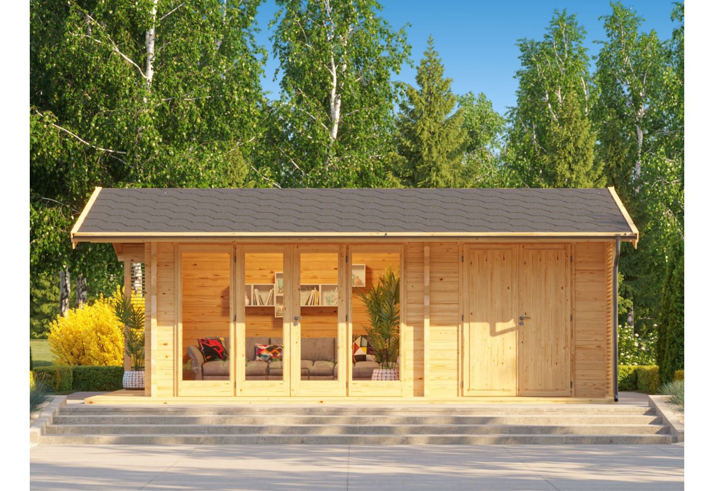 De Kalundborg 44 is een moderne tuinkamer met een strakke en eigentijdse uitstraling, ontworpen voor wie comfort en functionaliteit in de tuin wil combineren. Dankzij het stevige logprofiel van 44 mm biedt deze tuinkamer een solide en duurzame constructie. De ruime binnenruimte maakt het model geschikt voor diverse toepassingen, zoals een loungeplek, hobbyruimte of extra leefruimte in de tuin. Grote raampartijen zorgen voor veel lichtinval en een open karakter, waardoor binnen en buiten mooi in elkaar overlopen. Het gebruik van Noord-Europees Vurenhout geeft de tuinkamer een natuurlijke en warme uitstraling. De Kalundborg 44 vormt een stijlvolle aanvulling op de tuin en biedt het hele jaar door een prettige plek om te ontspannen of te werken. Door de onbehandelde uitvoering is het mogelijk om de afwerking volledig naar eigen smaak te bepalen.