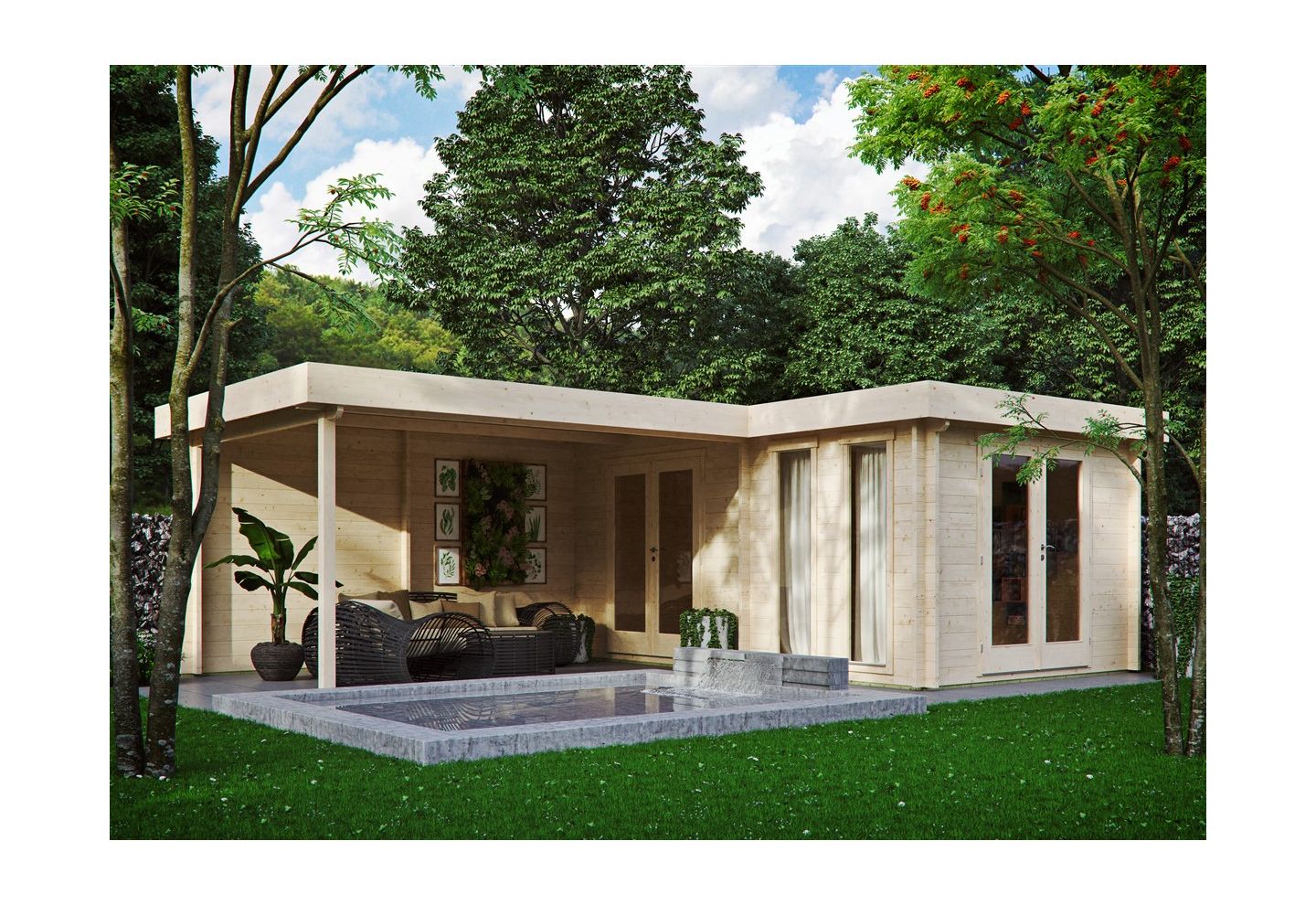 Als je op zoek bent naar iets speciaals met een WOW-factor, dan is Luisa 44 het tuinhuis om te kopen. Deze trendy tuinkamer met grote veranda is voorzien van stevige 44 mm wanden en dubbele beglazing. Luisa 44 wordt ook veel gebruikt als tuinkantoor of als familieverblijf.