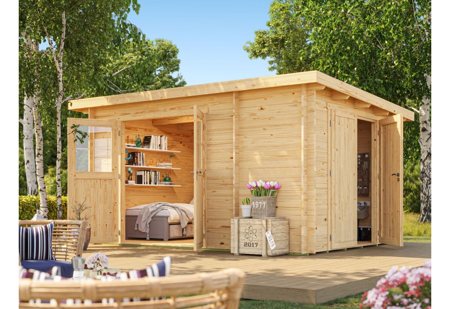 ?Met een dakgoot aan uw product, wordt het regenwater opgevangen, en kan u door middel van een regenton het water op een later gewenst moment gebruiken voor uw tuin. Een bijkomend voordeel van een dakgoot is dat de wanden, en met name de onderste plank laag zo droog mogelijk blijven, waardoor u langer van uw blokhut of tuinhuis kan genieten.